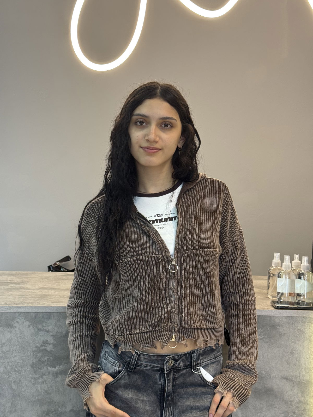 Camperita tejida ,con rotura , bolsillo y doble cierre